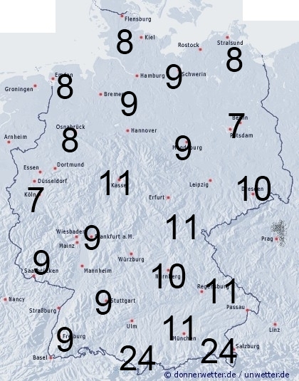 In Deutschland fällt gebietsweise Niederschlag in Form von Regen, Sprühregen oder auch Schnee vor allem in Teilen Bayerns und Sachsens. Sonst entsteht Benetzung durch Feuchtigkeit wie Tau- oder Reifansatz. Die Benetzungsdauer liegt allgemein zwischen 7 und 11 Stunden. Bei einer vorhandenen Schneedecke können bis zu 24 Stunden erreicht werden.
