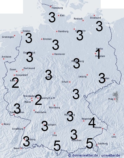 Im Westen, sowie in Teilen Bayerns kann es zu örtlichen Gewittergüssen kommen. Sonst entsteht Benetzung durch nächtlichen Strahlungstau. Die Benetzungsdauer liegt im allgemeinen zwischen 1 und 5 Stunden.