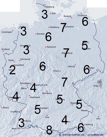 Vor allem über der Landesmitte um im Nordosten muss mit einigen teils kräftigen Regengüssen und Gewittern gerechnet werden. Sonst entsteht leichte Benetzung durch nächtlichen Strahlungstau. Die Benetzungsdauer liegt allgemein in Deutschland zwischen 2 und 5 Stunden, bei Regenschauern, sowie am Alpenrand können auch mehr erreicht werden.