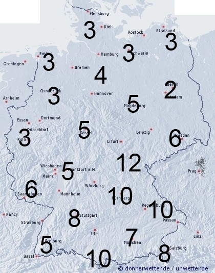Im Norden bleibt es überwiegend niederschlagsfrei. Leichte Benetzung entsteht hier durch nächtlichen Strahlungstau. Sonst muss gebietsweise mit örtlichen teils kräftigen Schauern und Gewittern gerechnet werden. Die Benetzungsdauer liegt im Norden und Nordosten meist nur zwischen 2 und 4 Stunden, sonst können bei Regengüssen zwischen 5 und 12 Stunden erreicht werden.
