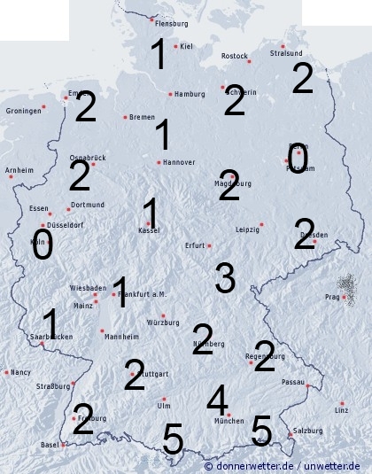 In Deutschland muss regional mit etwas Regen, sowie örtlichen teils gewittrigen Schauern gerechnet werden. Die Benetzungsdauer liegt dabei meist zwischen 2 und 5 Stunden. Sonst entsteht leichte Benetzung durch nächtlichen Strahlungstau.