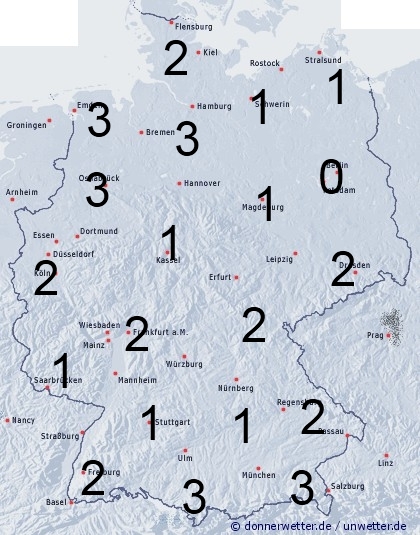 Vor allem im Nordwesten kann es im Tagesverlauf zu örtlichen Schauern und Gewittern kommen. Die Benetzungsdauer liegt hier zwischen 2 und 3 Stunden. Sonst treten nur über den Mittelgebirgen und an den Alpen einzelne Wärmegewitter mit örtlicher Benetzung auf. Leichte Benetzung kann ebenfalls durch nächtlichen Strahlungstau entstehen.