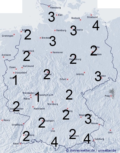 Im Norden sorgen örtliche Schauer für eine Benetzungsdauer zwischen 2 und 4 Stunden. Sonst entsteht Benetzung durch nächtlichen Strahlungstau zwischen 1 und 4 Stunden.