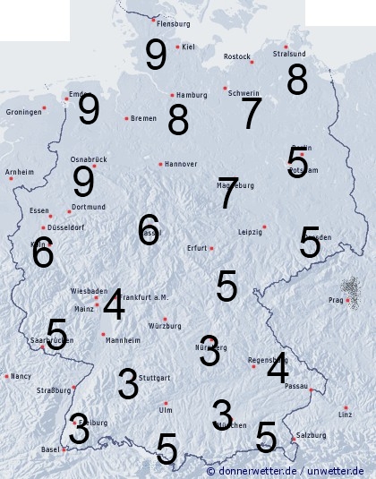 In der Nordhälfte regnet es längere Zeit, daher ist hier auch die Benetzungsdauer mit 5 bis 9 Stunden auch am höchsten. Sonst treten gelegentlich Schauer auf, mit einer Benetzungszeit meist zwischen 3 und 5 Stunden.