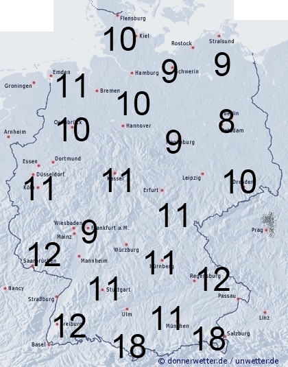 Die Benetzungsdauer liegt allgemein zwischen 7 und 13 Stunden, an den Alpen auch höher. Bei einer vorhandenen Schneedecke in den Bergen werden bis 24 Stunden erreicht.