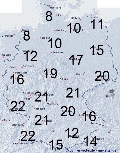Dauerregen sorgt in größeren Gebieten unseres Landes für hohe Benetzung. Längere Zeit niederschlagsfrei bleibt es im Norden, sowie in Teilen Bayerns. Sonst entsteht Benetzung durch Feuchtigkeit wie z.B. Tauansatz. Die Benetzungsdauer liegt in Deutschland allgemein zwischen 15 bis 22 Stunden. Im Norden und in Teilen Bayerns sind es meist 8 bis 14 Stunden. Allerdings können auch hier außerhalb von Ortschaften in geschützen freien Lagen höhere Werte erreicht werden.