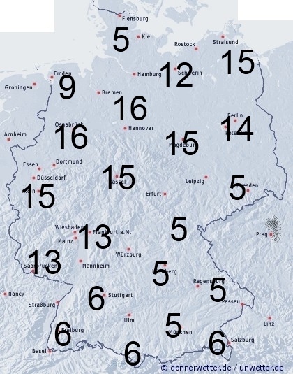 Ein Regengebiet dringt allmählich von Nordwesten in die Landesmitte voran und liegt dann diagonal über Deutschland. Sonst entsteht Benetzung durch Feuchtigkeit wie Tauansatz. Die Benetzungsdauer liegt in einem Streifen diagonal über Deutschland zwischen 9 und 16 Stunden. Sowohl in Schleswig-Holstein, als auch im Südosten werden meist nur 4 bis 8 Stunden erreicht. Bei einer vornandenen Schneedecke in den Bergen sind bis zu 24 Stunden möglich.