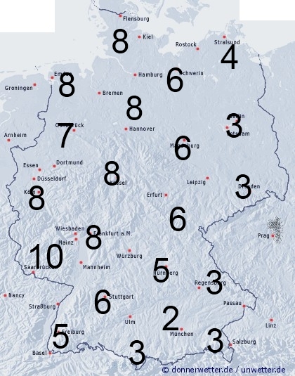 Bei einem lebhaften Wind kommt es in Deutschland zu Regenfällen oder Schauern. Am längsten trocken bleibt es im Osten, sowie in Teilen Bayerns. Hier liegt die Benetzungsdauer auch nur zwischen 2 und 5 Stunden, sonst werden zwischen 5 und 10 Stunden erreicht.