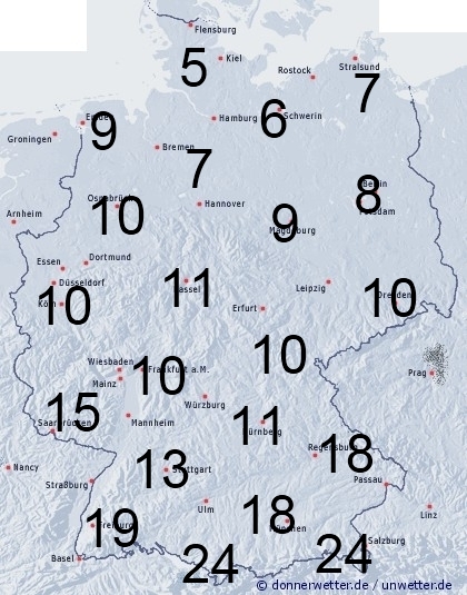 Vor allem im Südwesten und Süden fällt längere Zeit bis in tiefere Lagen Schnee oder Schneeregen. Sonst ist mit teils schauerartigen Niederschlägen zu rechnen, die teils als Regen, teils als Schnee fallen können. Die Benetzungsdauer liegt in der Nordhälfte meist zwischen 5 und 11 Stunden, im Süden zwischen 10 und 19 Stunden. Bei einer vorhandenen Schneedecke können bis zu 24 Stunden erreicht werden.