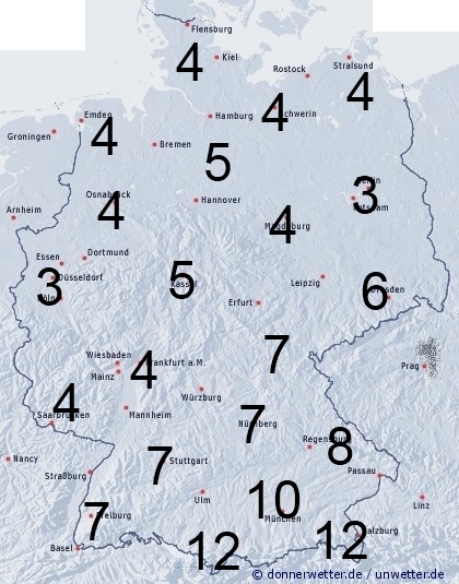 Im Süden und Osten treten regional Regengüsse und Gewitter auf. Sonst entsteht leichte Benetzung durch nächtlichen Strahlungstau. Die Benetzungsdauer liegt in den niederschlagsfreien Gebieten zwischen 3 und 5 Stunden, sonst zwischen 6 und 12 Stunden.