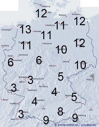 Im Norden fällt zeitweise Regen, südlich der Donau entwickeln sich ab dem Nachmittag örtliche Schauer und Gewitter. Sonst bleibt es mit Ausnahme einzelner Schauer niederschlagsfrei. Leichte Benetzung entsteht durch nächtlichen Strahlungstau. Die Benetzungsdauer liegt im Norden und südlich der Donau meist zwischen 7 und 13 Stunden, sonst werden allgemein nur 3 bis 7 Stunden erreicht.