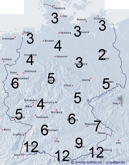 Vor allem im Süden und Westen ist mit Schauern und Gewittern zu rechnen. Sonst entsteht leichte Benetzung durch nächtlichen Strahlungstau. Die Benetzungsdauer liegt in Deutschland allgemein zwischen 2 und 5 Stunden, bei Regengüssen können aber auch zwischen 5 und 12 Stunden erreicht werden.