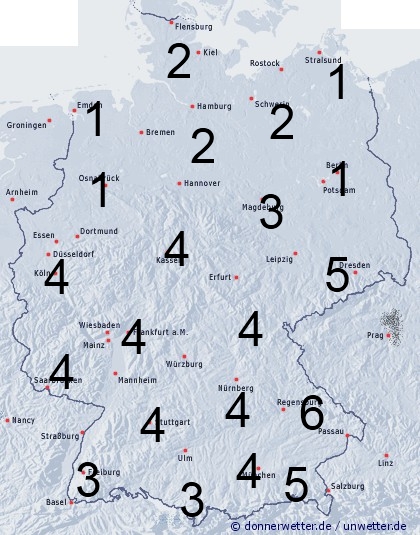 Vor allem über der Mitte und im Süden treten noch häufiger Schauer auf, daher erreicht hier die Benetzungsdauer meist zwischen 3 und 6 Stunden. Im Norden sind Schauer eher selten und somit auch die Benetzungszeit niedriger.