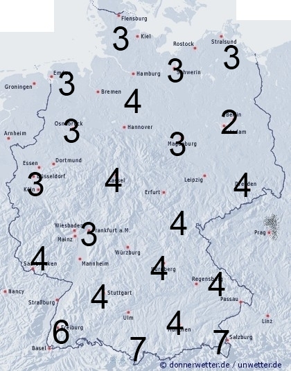 Nur vereinzelt treten noch Schauer und Gewitter auf. Sonst entsteht leichte Benetzung durch nächtlichen Strahlungstau. Die Benetzungsdauer liegt in Deutschland allgemein zwischen 2 und 7 Stunden.