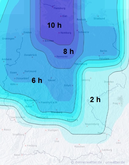 Wir stellen die Blattbenetzung generell in Stunden pro Tag auf der Karte dar. Durch die Lage des Feldes kann die Benetzungsdauer allerdings variieren.