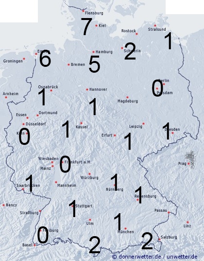 In Küstennähe der Nordsee, sowie in Schleswig-Holstein zieht im Tagesverlauf Regen auf. Die Benetzungszeit steigt hier auf 2 bis 7 Stunden, sonst ist es trocken und sommerlich warm. Leichte Benetzung entsteht nur durch nächtlichen Strahlungstau.