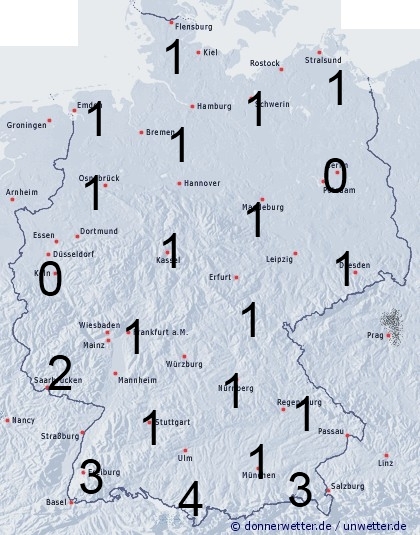 Im äußersten Süden und Südwesten kann es in sehr warmer und schwüler Luft zu örtlichen teils gewittrigen Regengüssen kommen. Die Benetzungsdauer liegt hier zwischen 1 und 4 Stunden. Sonst entsteht leichte Benetzung nur durch nächtlichen Strahlungstau.