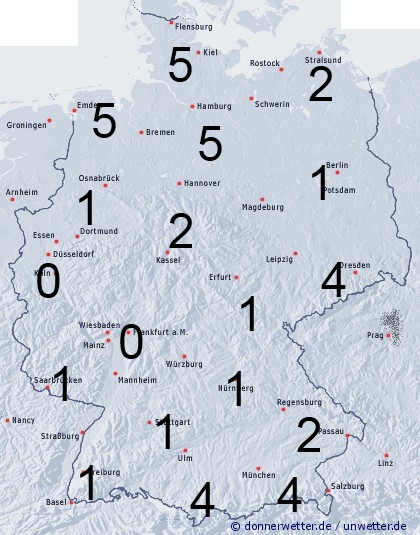 Vor allem im Norden, an den Alpen, sowie im Staubereich vom Erzgebirge gibt es bis zu 5 Stunden Benetzung durch etwas Regen, oder Schauer. Sonst entsteht leichte Benetzung nur durch nächtlichen Strahlungstau, oder Reif.