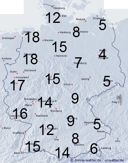Von Westen zieht allmählich eine Regenzone über Deutschland. Dabei erreicht die Benetzungsdauer in der gesamten Westhälfte zwischen 12 und 18 Stunden. Im Osten bleibt es noch bis zum Abend trocken. Benetzung entsteht hier durch nächtlichen Strahlungstau.