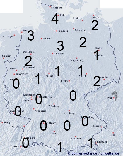 Die Benetzungsdauer erreicht im Norden bei örtlichen Schauern 2 bis 4 Stunden. Im übrigen Land gibt es keine oder nur geringe Benetzung durch nächtlichen Tau.