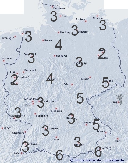 Über den östlichen Mittelgebirgen kann es zu örtlichen Schauern kommen. Sonst entsteht leichte Benetzung durch nächtlichen Strahlungstau. Die Benetzungsdauer liegt in Deutschland allgemein zwischen 2 und 6 Stunden.