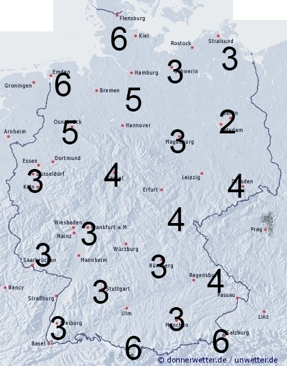 Im Nordwesten und Norden kann es im Tagesverlauf örtliche Regengüsse und Gewitter geben, sonst bleiben Schauer die Ausnahme. Leichte Benetzung entsteht auch durch nächtlichen Strahlungstau. Die Benetzungsdauer liegt in Deutschland allgemein zwischen 2 und 6 Stunden.