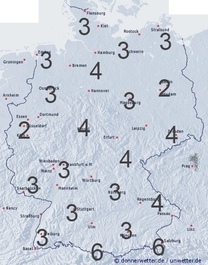 In Deutschland herrscht recht freundliches Wetter mit einer Mischung aus Sonne und Wolken, Schauer bleiben die Ausnahme. Leichte Benetzung entsteht in der Regel nur durch nächtlichen Strahlungstau. Die Benetzungsdauer liegt allgemein zwischen 2 und 4 Stunden. An den Alpen können auch bis 6 Stunden erreicht werden.