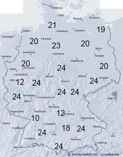 Die Benetzungsdauer liegt in den Gebieten mit einer Schneedecke bei 24 Stunden. Auch im Westen und Norden könnte die Benetzungsdauer bei Niederschlägen einen Wert von über 20 Stunden erreichen. Am trockenen Oberrhein ist sie wesentlich niedriger.