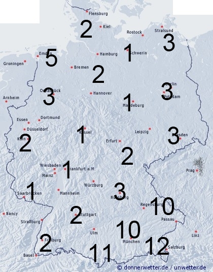 Südlich der Donau regnet es zunächst noch für längere Zeit mit einer Benetzungsdauer von zum Teil über 10 Stunden. Im Laufe des Abends setzt im Nordwesten neuer Regen ein. Die Benetzungsdauer erreicht hier bis zu 5 Stunden. Dazwischen bleibt es meistens trocken mit nur geringer Benetzung.