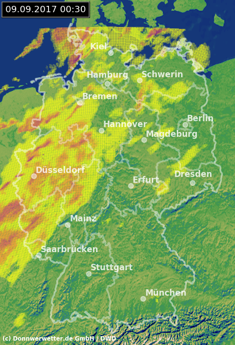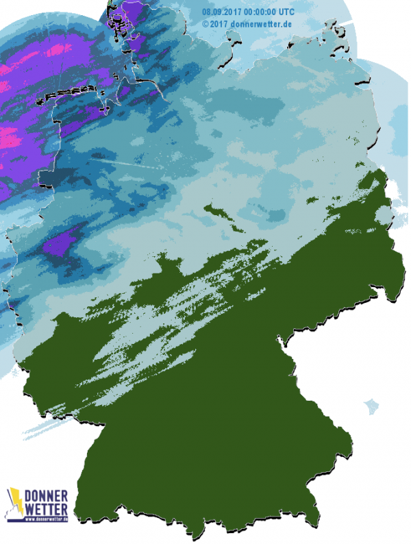 Heute erreicht der Regen im Tagesverlauf auch die südlichen und östlichen Gebiete unseres Landes. Im Nordwesten treten anfangs noch Schauer auf. Die Niederschlagsmengen liegen allgemein zwischen 5 und 25 Liter pro Quadratmeter, trocken bleibt es bis zum Abend nur an der Oder, sowie im östlichen Bayern.
