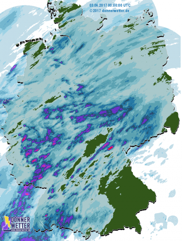 Das Radarbild zeigt aktuell ein von Frankreich heranziehendes umfangreiches Regengebiet, das schon den gesamten Südwesten Deutschlands abdeckt und bereits in die Mitte des Landes vorgedrungen ist. Außerdem sind im Süden noch regionale Gewitterzellen mit Starkregen aktiv. Eine weitere Gewitterzelle nähert sich der Hansestadt Hamburg. Lediglich in der Osthälfte ist es größtenteils trocken.