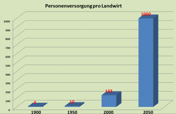 Zu Beginn des 20. Jahrhunderts versorgte ein Landwirt im Schnitt vier Personen mit seinen Produkten, 100 Jahre musste er bereits mehr als 30 Mal so viele Menschen versorgen. Bis 2050 wird sich die Zahl dann nochmals mehr als versiebenfachen.