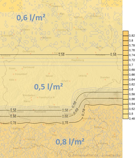 Heute und am Donnerstag fällt teilweise ergiebiger Regen, dazu drohen Sturm- und Orkanböen. In Verbindung mit dem Tauwetter bis ins höhere Bergland und Regenmengen an beiden Tagen zwischen 5 und 25 Liter pro Quadratmeter, regional auch noch mehr, drohen auch an größeren Flüssen einige Überflutungen. Dies gilt insbesondere für den Rhein und seine Nebenflüsse.