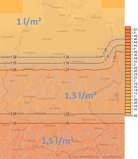Heute und am Donnerstag muss verbreitet mit teils kräftigen Regenfällen und Schauern gerechnet werden, dazu drohen Sturmböen. Vor allem vom Saarland, über die Pfalz und Südhessen bis nach Nordbayern sind gebietsweise Mengen von über 50 Liter pro Quadratmeter zu erwarten. Bäche und kleinere Flüsse können dabei stark anschwellen. Sonst liegen die Niederschlagsmengen allgemein zwischen 5 und 30 Liter pro Quadratmeter.