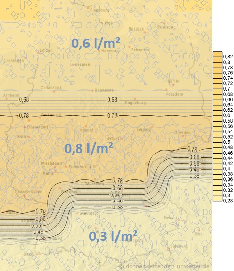 Auch am Dienstag fällt häufig Regen und Sprühregen. Dabei sind erneut Mengen zwischen 5 und 15 Liter pro Quadratmeter zu erwarten. Wahrscheinlich trocken bleibt es im Breisgau und in Teilen Mecklenburg-.Vorpommerns.