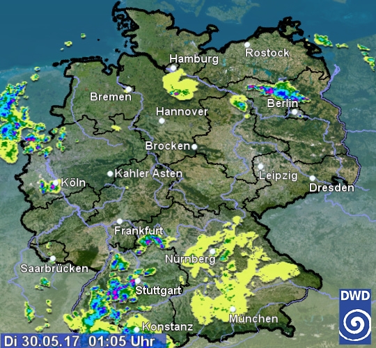 Das Radarbild zeigt aktuell vor allem über Baden-Württemberg Schauer- und Gewittersignale. Aber auch im Westen und Norden erkennt man einzelne Echos. Auch im weiteren Verlauf der Nacht muss mit örtlichen gewittrigen Regengüssen gerechnet werden.