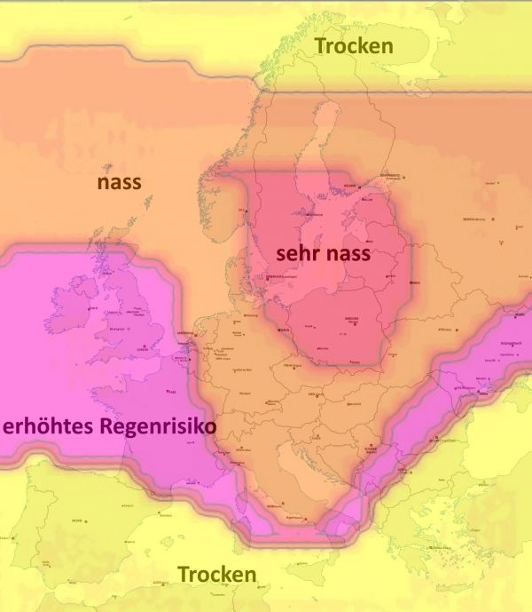 Zusätzlich ziehen ab Beginn der nächsten Woche feuchte Luftmassen mit Regenwolken über die Ostsee und das Baltikum und erreichen mit Ausläufern möglicherweise auch den Nordosten der Bundesrepublik.