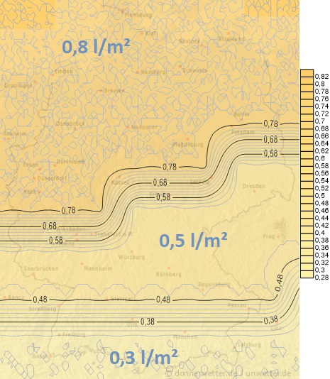 Heute fällt im Nordosten, sowie über den Mittelgebirgen etwas Regen oder Sprühregen. Die Mengen liegen jedoch meist unter 3 Liter pro Quadratmeter.
