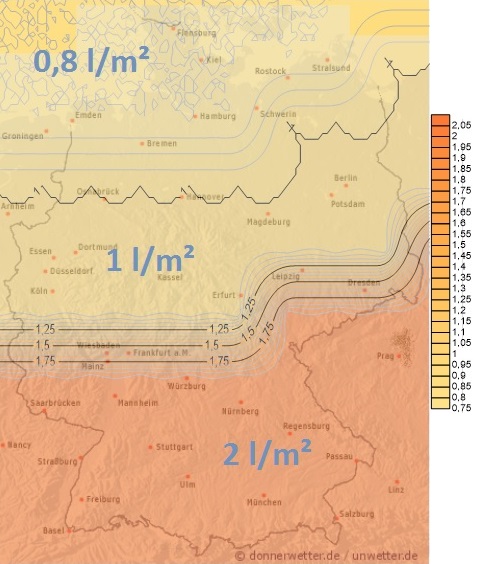 Heute fällt im Nordwesten und Norden zunächst zeitweise Regen, am Nachmittag gehen noch örtliche Schauer nieder, dabei können in Schleswig-Holstein und im Nordseeumfeld Mengen bis zu 10 Liter pro Quadratmeter erreicht werden. In der Mitte und im Süden bleibt es meistens trocken.