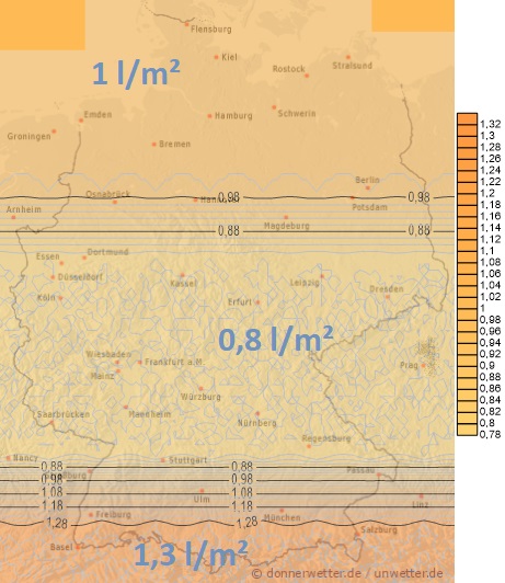 Heute kommt es im östlichen Baden-Württemberg, sowie in Teilen Bayerns zunächst noch zu Regenfällen mit Mengen von etwa 5 bis 15 Liter pro Quadratmeter, am Alpenrand örtlich auch über 20 Liter pro Quadratmeter, am Nachmittag treten noch einzelne Schauer auf. In den anderen Gebieten Deutschlands stellt sich eine kurze Wetterberuhigung ein, bevor in der Nacht auf Montag von Nordwesten mit deutlich auffrischendem Wind das nächste Regengebiet heran zieht.