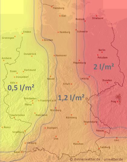 Am Dienstag könnte eine schwache Kaltfront von Westen lokale Schauer, oder Gewitter auslösen. Die Niederschlagsmengen liegen allerdings meist unter 5 Liter pro Quadratmeter.
