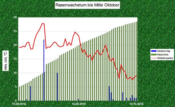 Angenommen der letzte Schnitt erfolgte am 15. August diesen Jahres, also vor 7 Wochen, dann ist die Wiese seitdem wieder um etwas mehr als 20 cm gewachsen. Extreme Trockenheit limitierte in vielen Landesteilen in den vergangenen Wochen das Pflanzenwachstum.