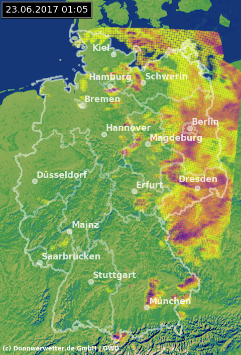 Das Radarbild zeigt aktuell noch zum Teil kräftige Schauer- und Gewittersignale über dem Nordosten und örtlich auch in Bayern an. Die Niederschläge werden sich jedoch allmählich aus Deutschland entfernen. Sonst hat sich die Wettersituation beruhigt und der Himmel ist gebietsweise aufgeklart.