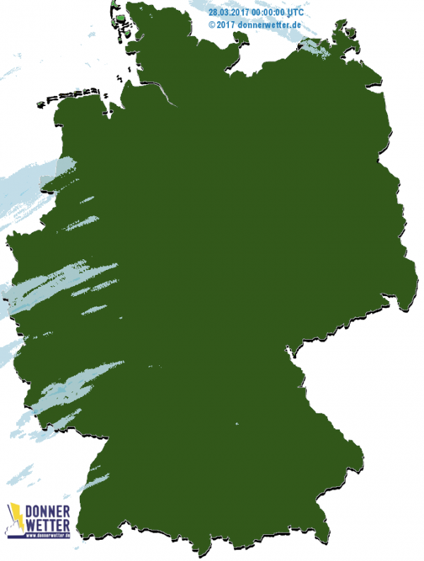 Das Radarbild zeigt zwar momentan schwache Signale. Etwas Regen fällt jedoch nur aus den etwas dunkleren Echos südwestlich und südlich von Bremen, sowie über der Nordsee. Sonst ist der Himmel über Deutschland meist nur leicht bewölkt oder sogar wieder wolkenlos.