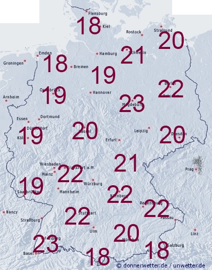Im nordwestlichen Teil Deutschlands, sowie in den Mittelgebirgen und Alpen liegen die Temperaturen im Erdboden unterhalb der 20 Grad - Marke. Sonst werden zwischen 20 und 23 Grad gemessen, an der unteren Donau, sowie am Oberrhein teilweise auch bis zu 25 Grad.