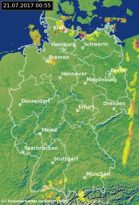 Das Radarbild zeigt aktuell ganz im Norden, sowie im südlichen Baden-Württemberg noch einige Schauersignale. In Schleswig-Holstein blitzt und donnert es auch örtlich. Sonst ist der Himmel über Deutschland teils bewölkt, teils klar. Stellenweise haben sich in der feuchten Luft einige Dunst und flache Nebelfelder gebildet.
