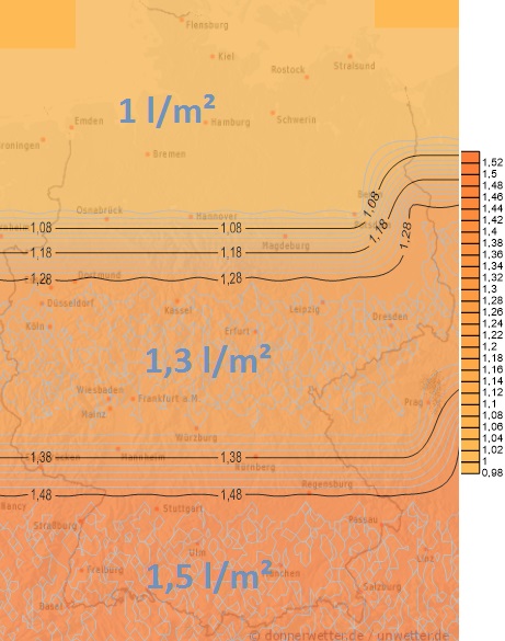 Heute können in der Nordhälfte noch Schauer und örtliche Gewitter auftreten, aber auch im Alpenvorland sind noch einzelne Regengüsse möglich. Die Niederschlagsmengen liegen meist unter 10 Liter pro Quadratmeter, lediglich in Schleswig-Holstein können örtlich auch mehr als 10 Liter erreicht werden. Dazwischen gibt es eine größere freundliche und trockene Zone.
