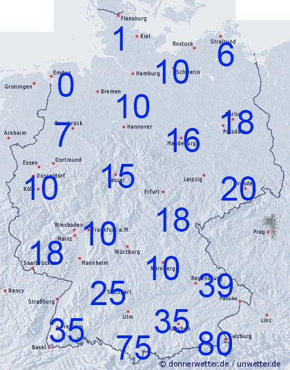 Bei den bis Samstag 00 UTC zu erwarteten Niederschlagssummen gibt es ein klassisches Nordwest - Südost - Gefälle. Während im Nordwesten kaum Niederschlag zu erwarten ist, können speziell im Alpenvorland Niederschlagsmengen zwischen 50 und 100 Liter pro Quadratmeter fallen. Auch in anderen Regionen kann es schauerbedingt zu hohen Niederschlagssummen kommen. Die zu erwartenden Niederschlagsmengen sind geschätz und können auf engstem Raum deutlich voneinander abweichen.