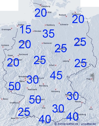 In Deutschland treten weitere teils kräftige Regengüsse und Gewitter auf. Auf der Karte finden sie die gemittelten Niederschlagssummen bis Montag 00 UTC. Wegen der aktuellen Wetterlage kann es aber schon auf engstem Raum zu größen Abweichungen kommen. Bei Unwetter können bis 100 Liter Niederschlag pro Quadratmeter oder auch mehr fallen. Stellenweise drohen auch Hagelschläge. Regional passiert nicht viel und es bleibt trocken.