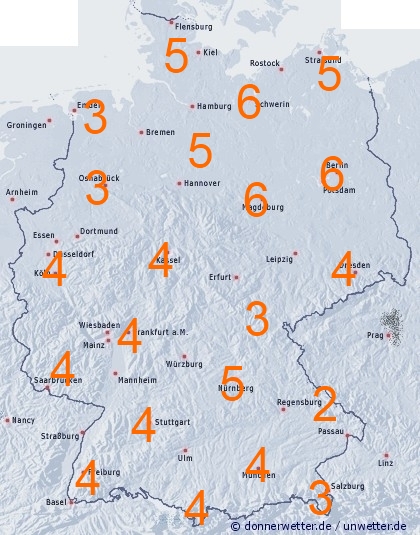 Die tägliche potentielle Verdunstung liegt allgemein zwischen 3 und 5 Liter pro Quadratmeter. Bei hohen Temperaturen sind es in Teilen Nordostdeutschlands sogar über 6 Liter pro Quadratmeter die verdunsten können. Im Bayrischen - Wald, sowie im Bereich der Zone, in der Regengüsse und Gewitter häufig auftreten jedoch nur 1 bis 3 Stunden.